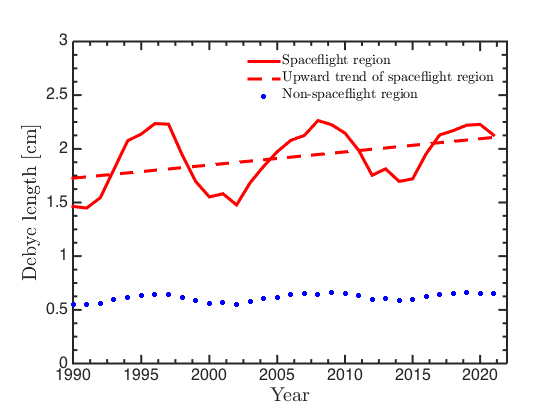 According ionospheric models, the lower regions of the ionosphere are particularly difficult for acquiring data and measurements. These regions are too low for satellite in situ measurements and difficult to sound from the ground typically because of the low ion/electron densities and high neutral densities. So data in this region on electron density relies on rocket measurements [2]. However, data in a region slightly higher than the meteor ablation zone, already shows there may be concern because spaceflight regions are showing much higher Debye lengths than non-spaceflight regions, as shown in Figure 3.