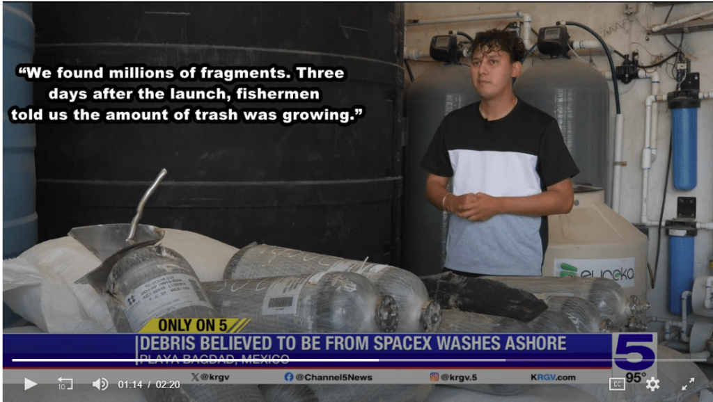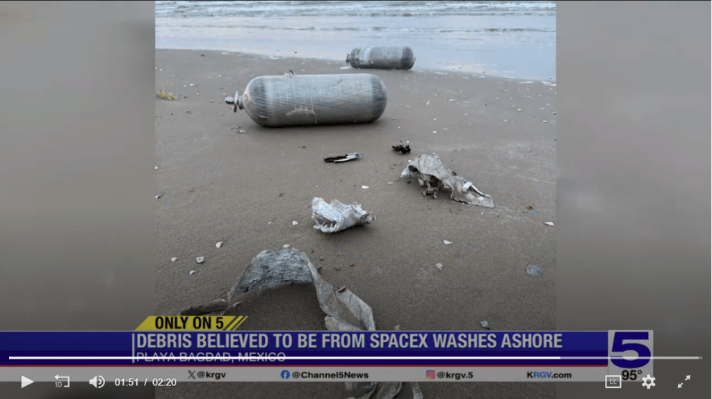 May SpaceX explosion rained tanks and debris on ocean and beach; fisherman report dolphin and fish deaths Posted byadminOctober 3, 2025October 3, 2025Posted inUncategorizedTags:Boca Chica, debris, dolphins, Elon Musk, environmental health, FAA, fish, Mexico, ocean, polution, SpaceX, Texas Report: https://www.krgv.com/news/debris-believed-to-be-from-spacex-launch-washes-up-in-matamoros-beach Share this: Click to share on X (Opens in new window) X Click to share on Facebook (Opens in new window) Facebook Like Loading... Related