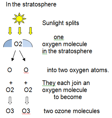 The Sun’s UV rays break apart an oxygen molecule into 2 oxygen atoms. Each oxygen atom then binds with another oxygen molecule to create an ozone molecule.